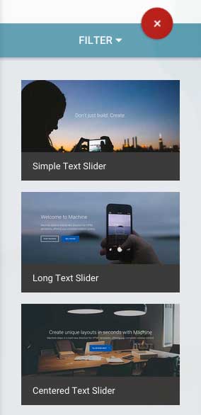To add a section, click the circular plus button on the 'Content' tab in the sidebar. This will open the 'Add Sections' panel. From here, add sections to your page by clicking on their thumbnail (see figure 2.1.1). You will notice that section types are categorised and are filterable by clicking on the appropriate filter button at the top (eg. 'Dividers' will show sections that have full width background images)