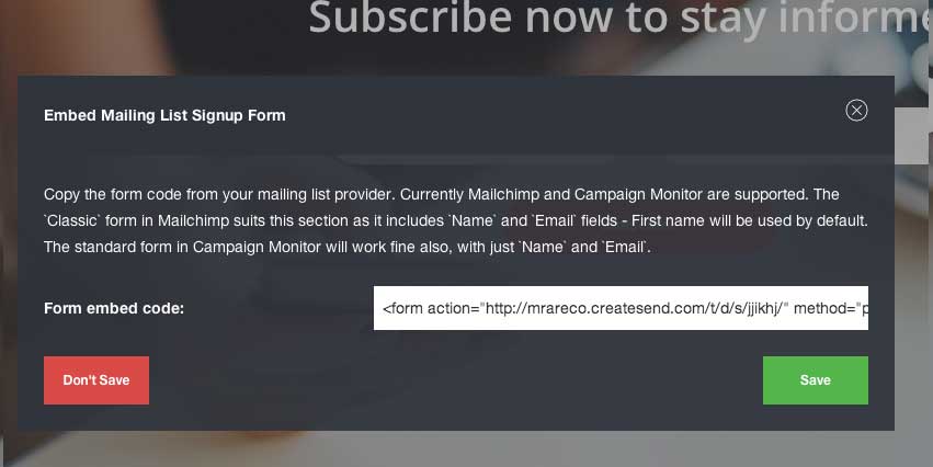 • Paste the form code into the 'Form Embed Code' field in the 'Embed Mailing List Form' modal and click 'Save'
