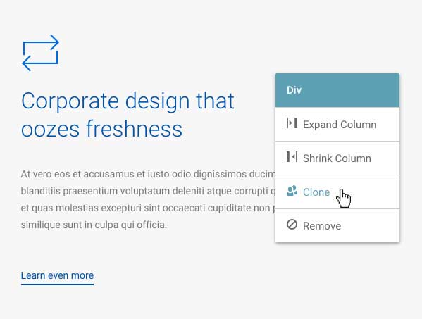 Variant enables you to clone content by right-clicking on an element and selecting 'Clone' from the context menu (see figure 3.5.1). This will make an exact copy of the element and is especially useful for sections such as 'services' (where you may require more than the section initially shows).