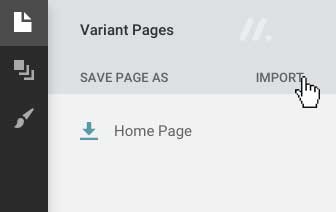 To import a page, click the 'Import' button on the 'Pages' tab. Browse for your .variant file and click 'Open'. Once imported, a modal will appear with an Import report.