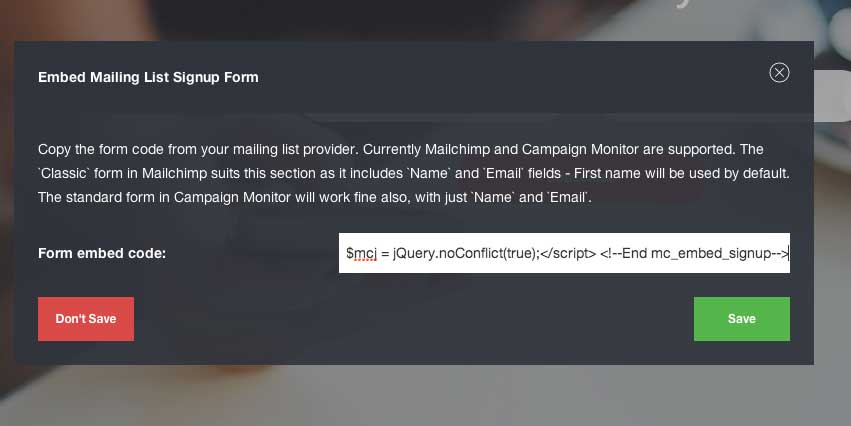 figure 4.3.1 Enter your copied form code from MailChimp into this field