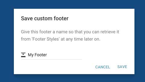 The first time you change text on the footer, you will be prompted to name and save the footer (see figure 5.1.2). Once done - your saved footer will appear in the 'Footer Styles' dropdown. This makes it easy to use the same footer across multiple pages.