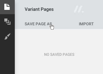 To export a page, first save it (as described in 7.1), then hover on the page's title in the 'Pages' tab. Click the green download icons to export the page. The page should download as a .variant file immediately from your browser. Alternatively you can export all saved pages to a single .variant file by clicking '.variant' button when hovering on the 'Export' button at the bottom of the pages tab.