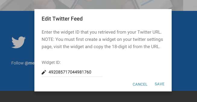Do this by going to the 'Settings' page of your Twitter account and clicking 'Widgets'. Click 'Create New' and then 'Create Widget'. One done, go back to the 'Widgets' page and click 'Edit' on your newly created widget. From here you need to copy the widget id out of the url bar. The widget id is the long numerical string after /widgets/ and before /edit and paste it into the 'Widget ID' box of the 'Edit Twitter Feed' modal.